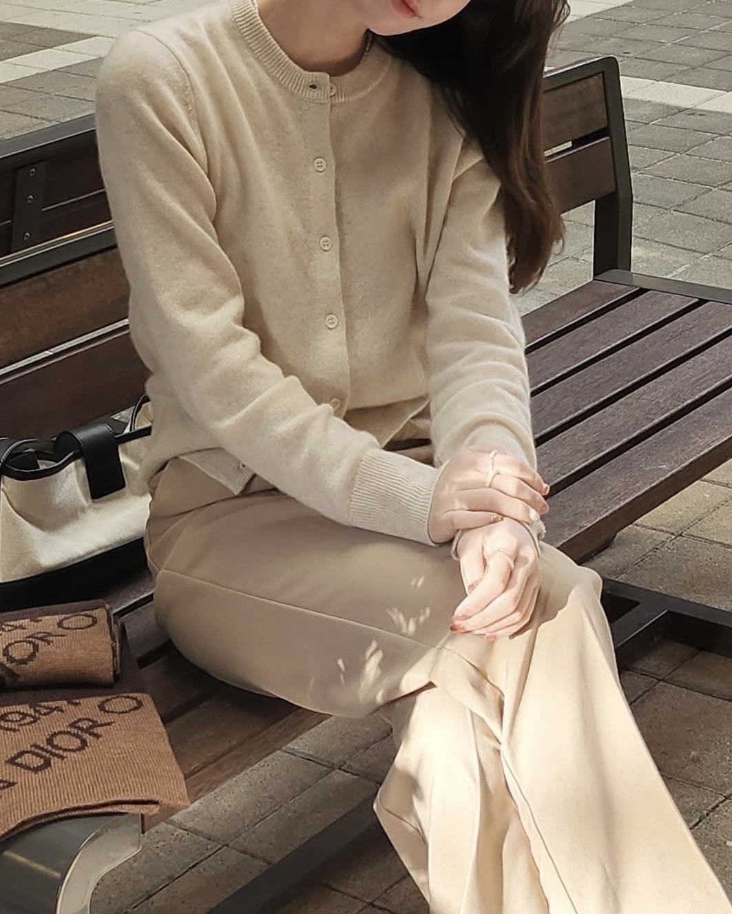 보통 가디건만 입으면 까끌거리는데 캐시 100%라서 부드러워 반팔 없이 하나만 입어도 되더라구요 :) 오트 색상이 오묘한 타 브랜드에서 못 본 색이라 다양하게 코디할 수 있어서 좋았어요 ㅎㅎㅎ