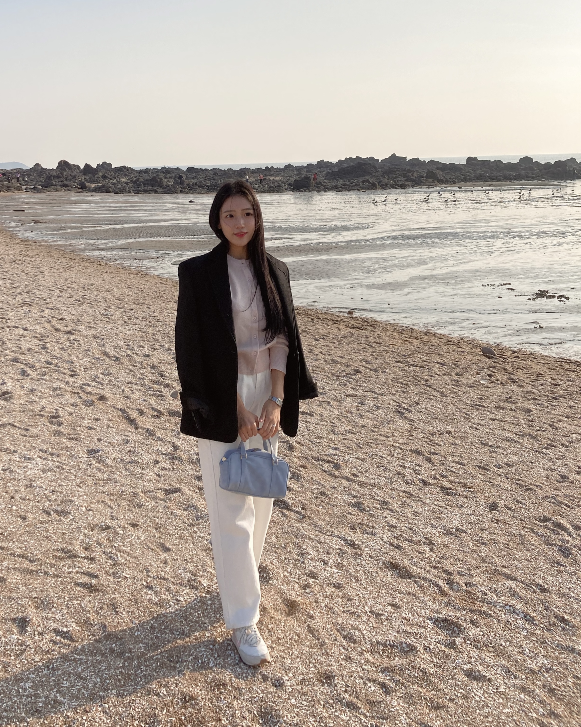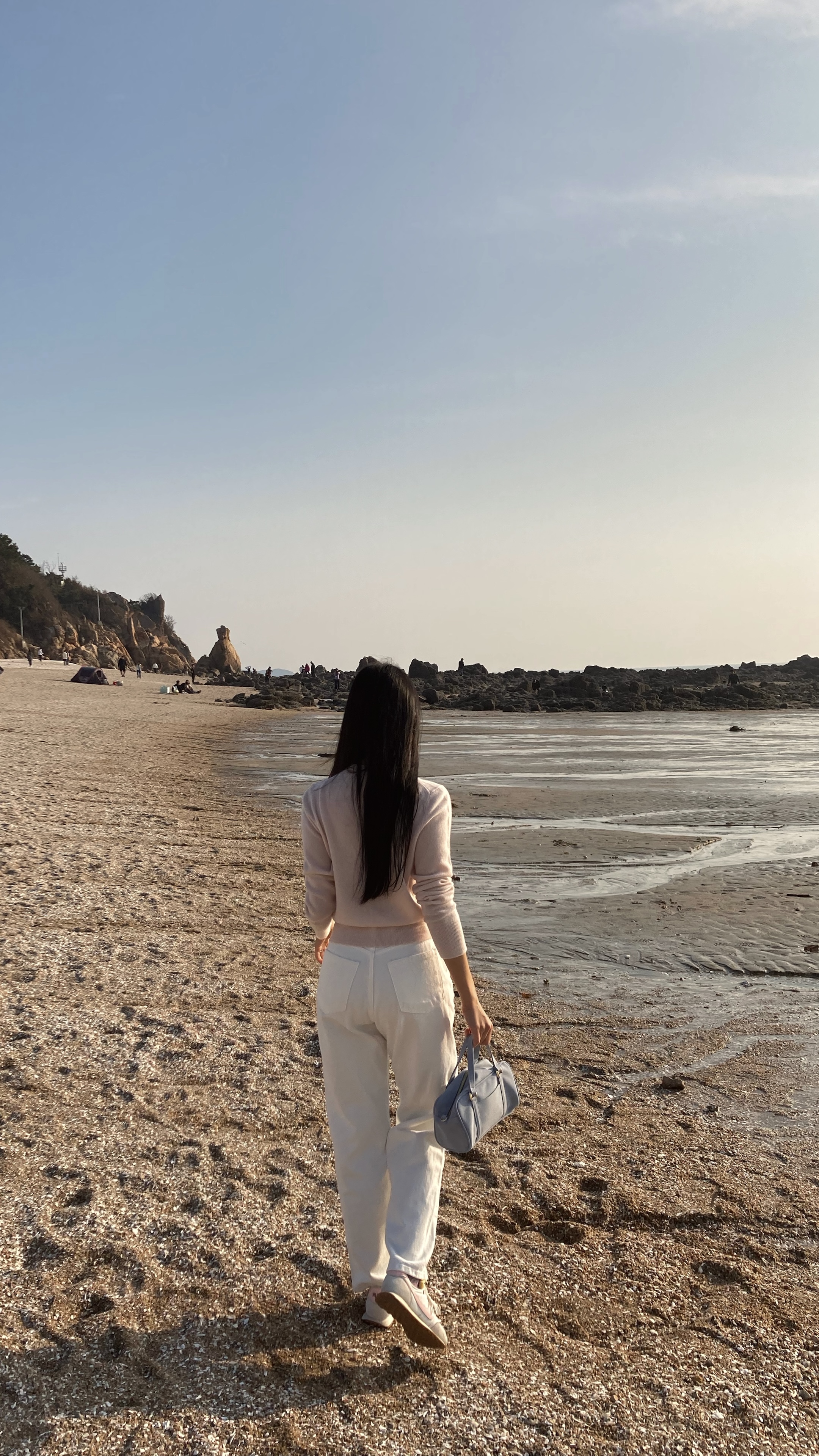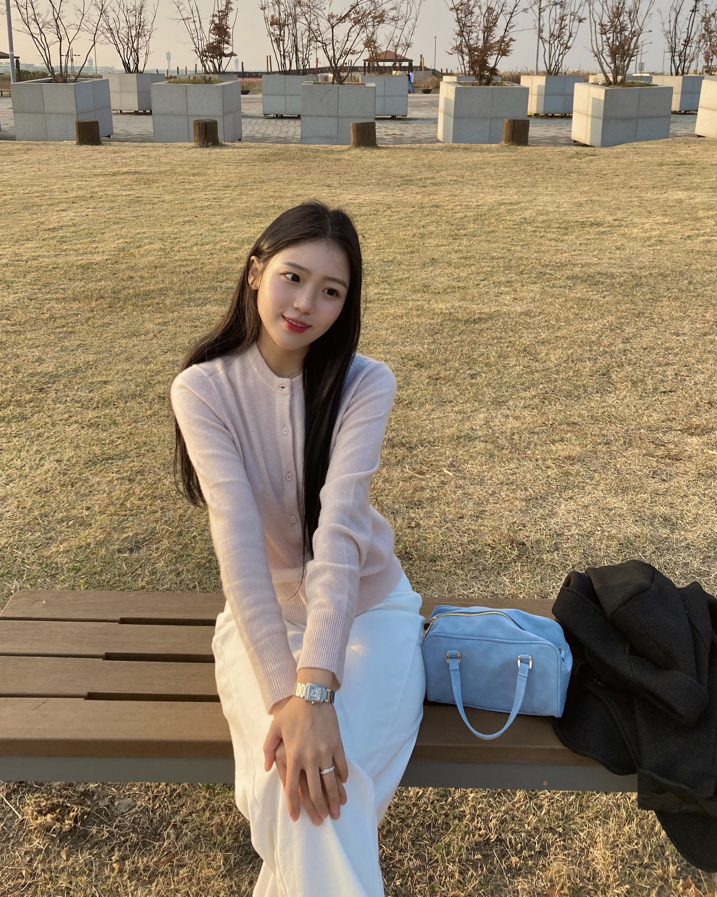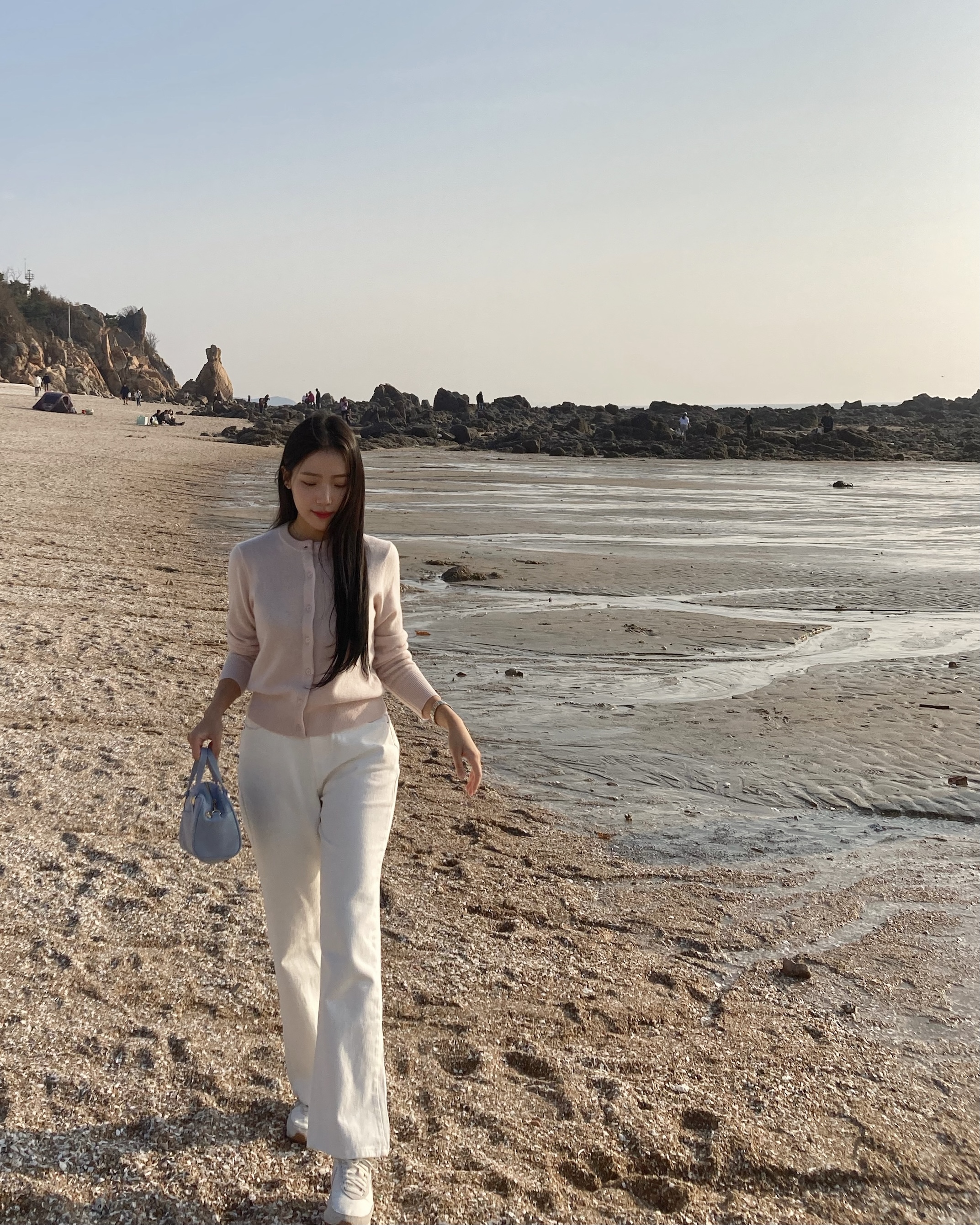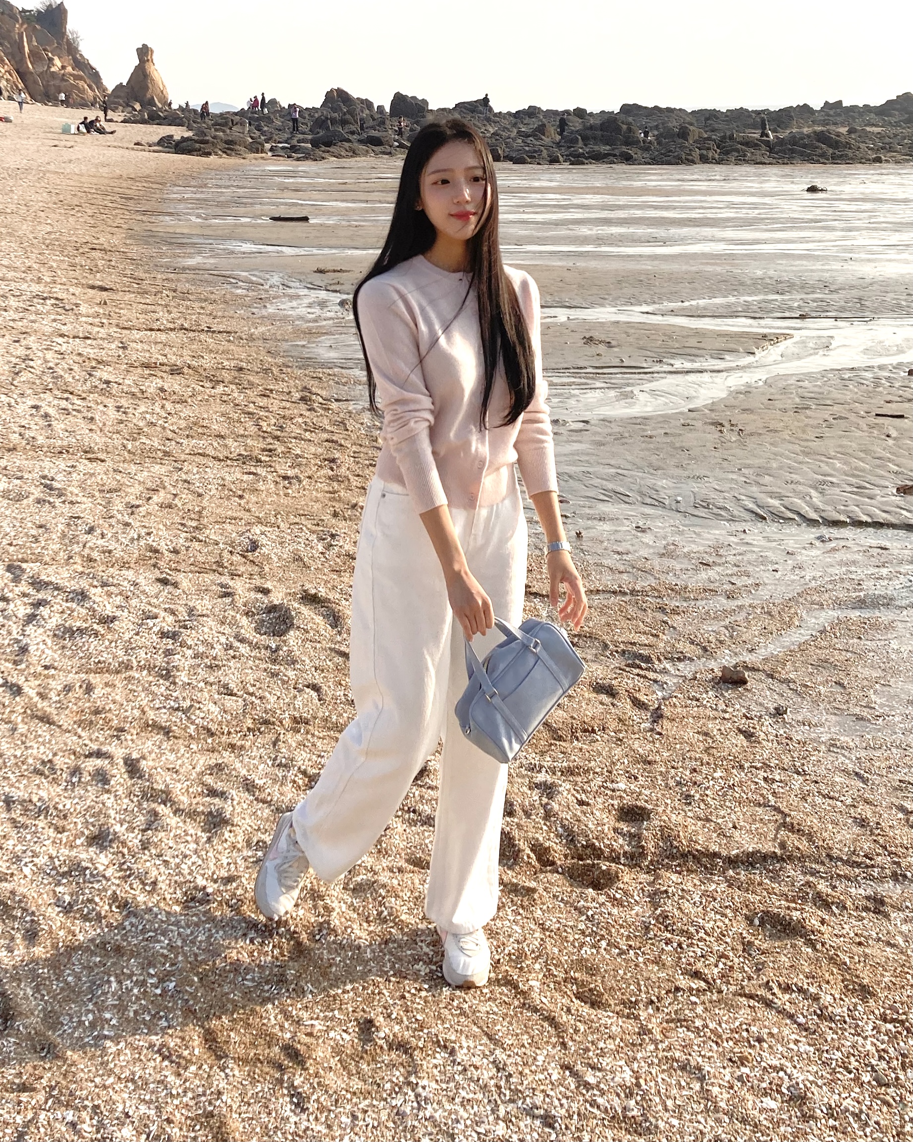 색감도 너무 딥하지 않은 라이트 핑크+화이트 한방울 들어간 색이어서, 가을에 단독으로 입어도 좋고 겨울철 코트 안에 이너로 입으면 더욱 포인트가 되고 화사할 것 같아요. 주변에서 다들 핏도 컬러도 예쁘다고 하네요!