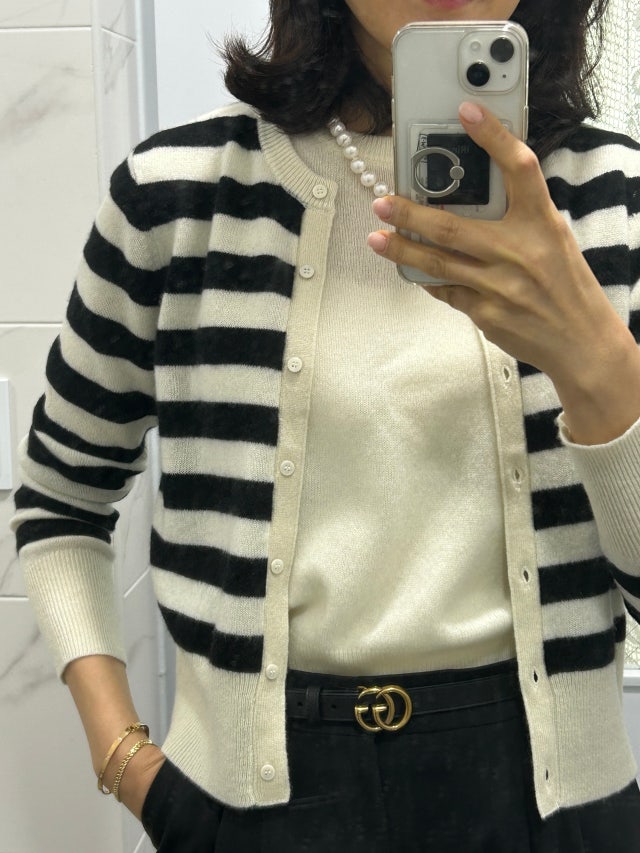 이번에 스트라이프 가디건과 같은색 가디건도 구입했는데 어느것과 매치해도 셋트처럼 좋습니다!