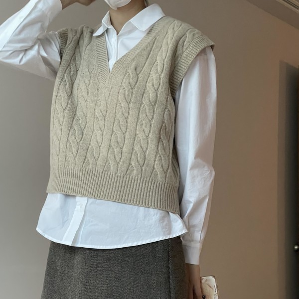 [직원리뷰] 저는 100% Wool Cable Vest_Sand Beige를 착용했는데요, 디자인이 베이직해서 모직치마나 청바지, 반바지와도 잘 어울렸고, 셔츠를 활용해서 입어도 예쁘지만 목티와 함께 입어도 좋을 듯 합니다 :) (직원 스펙 : 키-169cm, 평소사이즈-55)