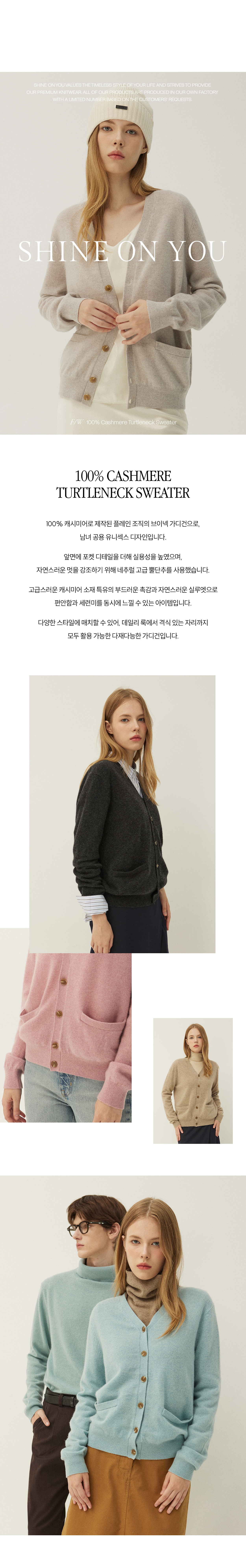 SHINE ON YOU values the timeless style of your life and strives to provide our premium knitwear. All of our products are produced in our own factory with a limited number based on the customers' requests.