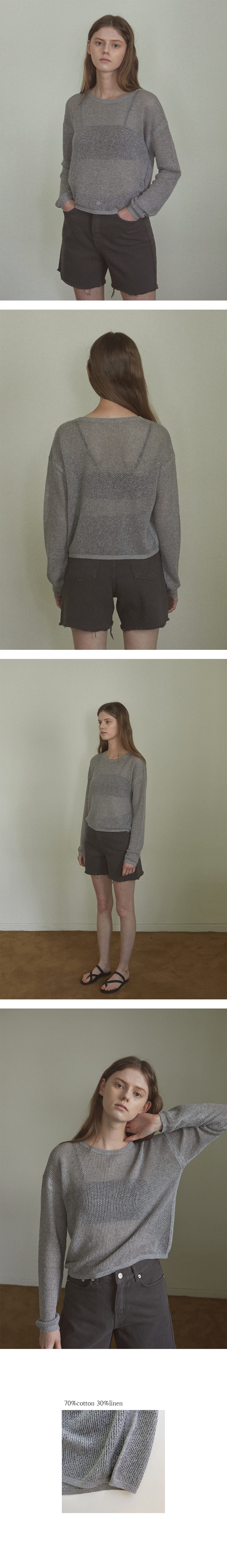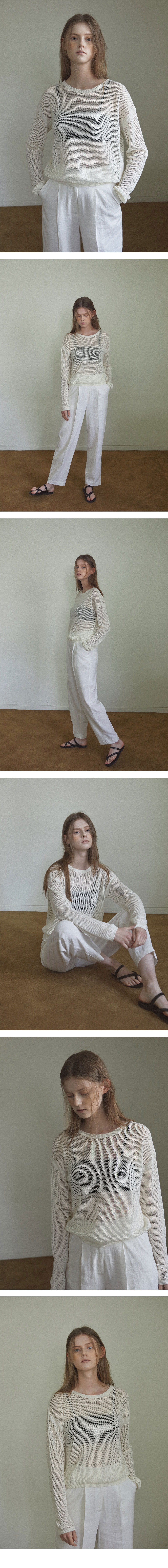 '루즈핏 long sleeve 라운드 넥의 아일렛조직과 플랜조직의 패턴변화로 intarsha 효과를 냅니다.