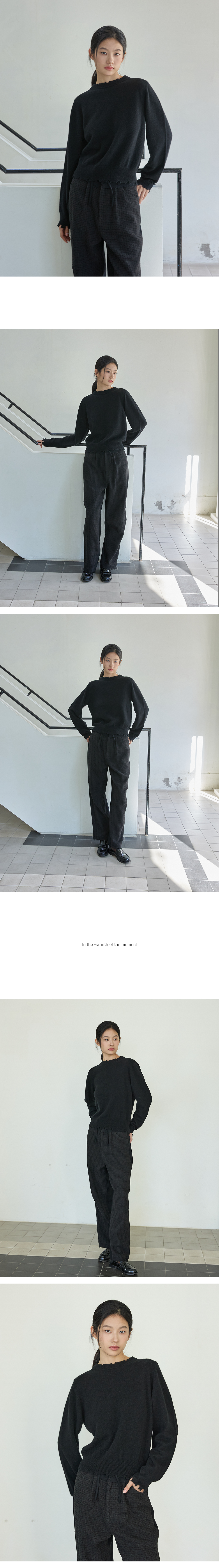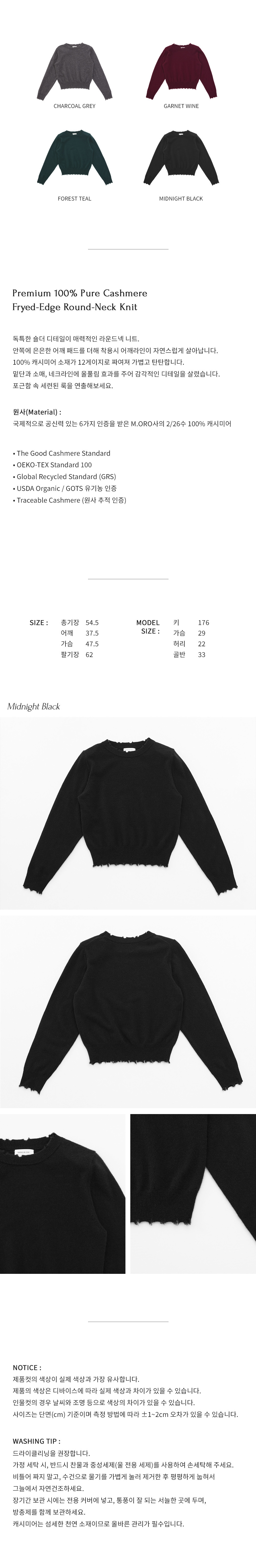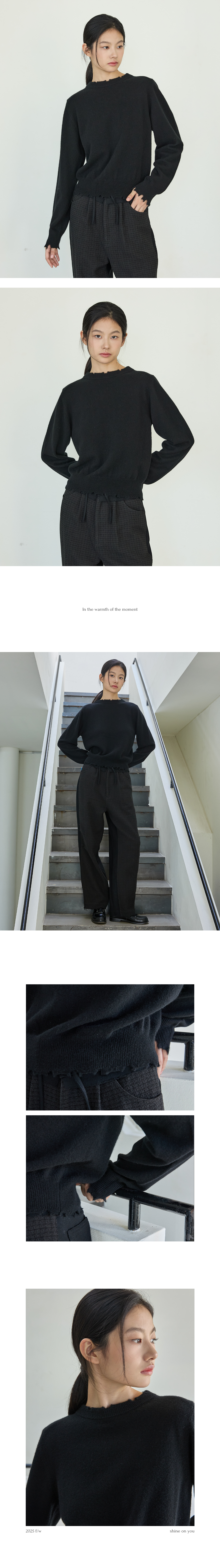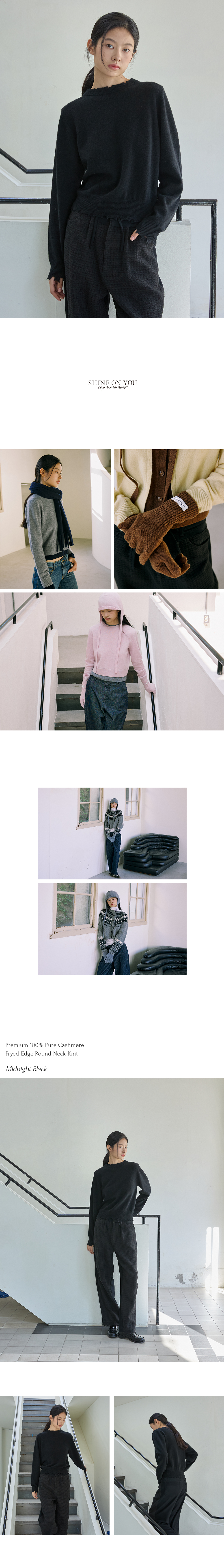 Premium 100% Pure Cashmere Frayed-Edge Round-Neck Knit_ Midnight Black